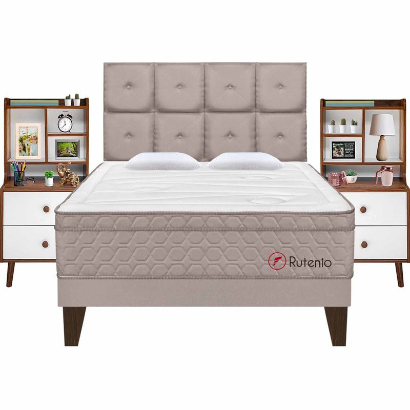 Colchón + Tarima Europea Beige + Cabecera Kimiko + 02 Veladores Repisa Fashion + 02 Almohadas Viscoelásticas + Protector de colchón