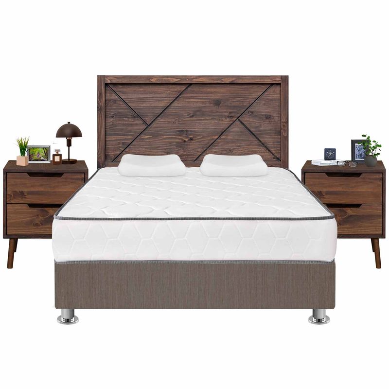 Colchón + Protector acolchado + Tarima + 02 Almohadas + Cabecera de Madera + 02 Veladores de Madera