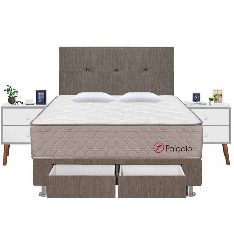 Colchón + Cabecera + Tarima con 2 cajones + 02 Almohadas Viscoelásticas + 02 Veladores Viena + Protector de colchón